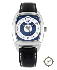 A Dress watch with a vintage-inspired 31.5mm case, crafted from stainless steel featuring a blue dial with a unique concentric guilloche finish.