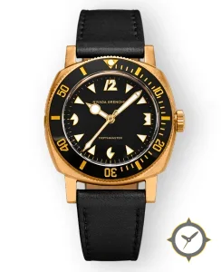 A Dive watch with a versatile 40mm case, that suits most wrists, crafted from gold featuring a black dial with a unique matte finish.