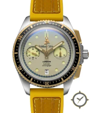 A Dive watch with a vintage-inspired 34.5mm case, crafted from stainless steel featuring a yellow dial with a unique matte finish.
