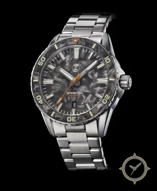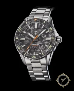 A Dive watch with a vintage-inspired 35.5mm case, crafted from stainless steel featuring a gray dial with a unique swirled/marbled carbon or mother-of-pearl-like texture finish.