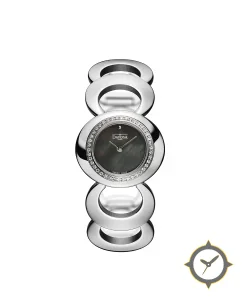 A Dress watch with a vintage-inspired 25mm case, crafted from stainless steel featuring a black dial with a unique mother-of-pearl finish.