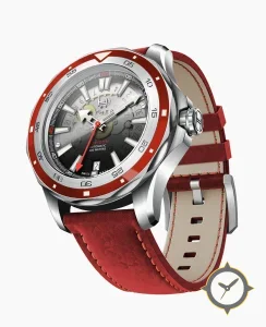 A Dive watch with a versatile 39mm case, that suits most wrists, crafted from stainless steel featuring a gray dial with a unique partially skeletonized / open-heart with visible gears and a subtle sunburst finish finish.
