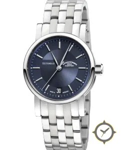 A Dress watch with a vintage-inspired 35mm case, crafted from stainless steel featuring a blue dial with a unique sunburst finish.
