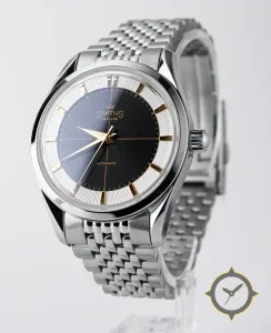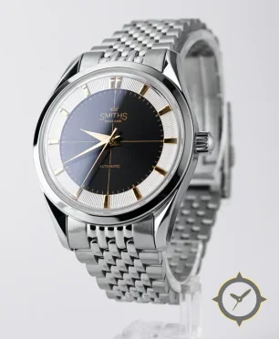 A Dress watch with a vintage-inspired 34.5mm case, crafted from stainless steel featuring a black dial with a unique smooth central dial with fluted outer chapter ring finish.