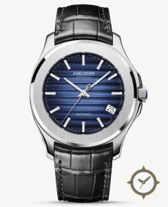 A Dress watch with a bold 42mm presence on the wrist, crafted from stainless steel featuring a blue dial with a unique horizontal ribbed / brushed texture (wave-like stripes) finish.