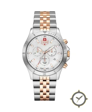A Chronograph watch with a bold 50mm presence on the wrist, crafted from stainless steel featuring a white dial with a unique vertical guilloché/striped finish.