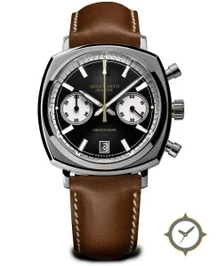 A Chronograph watch with a vintage-inspired 36.5mm case, crafted from stainless steel featuring a black dial with a unique sunburst finish.