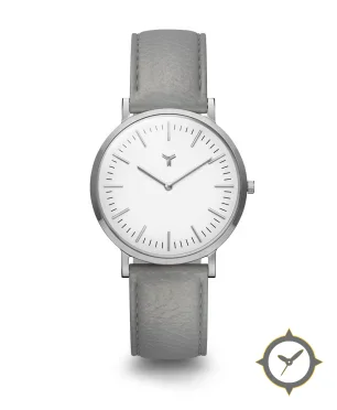 A Minimalist watch with a vintage-inspired 32mm case, crafted from stainless steel featuring a white dial with a unique matte finish.