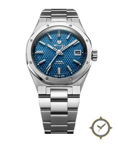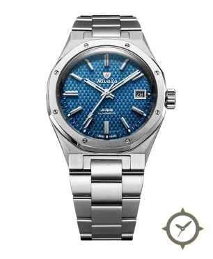 A Sports watch with a versatile 38.5mm case, that suits most wrists, crafted from stainless steel featuring a blue dial with a unique woven/carbon-fiber weave texture finish.