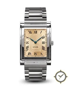 A Dress watch with a vintage-inspired 28.5mm case, crafted from stainless steel featuring a gold dial with a unique clous de Paris / guilloché waffle texture in the central area, smooth outer chapter ring finish.