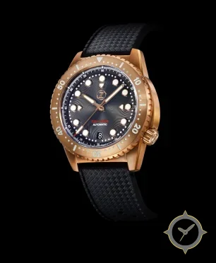 A Dive watch with a vintage-inspired 33.5mm case, crafted from bronze featuring a black dial with a unique sunburst / radiating wave guilloché finish.