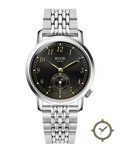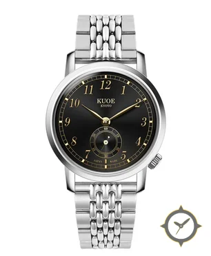 A Dress watch with a vintage-inspired 31.5mm case, crafted from stainless steel featuring a black dial with a unique lacquered sunburst finish.