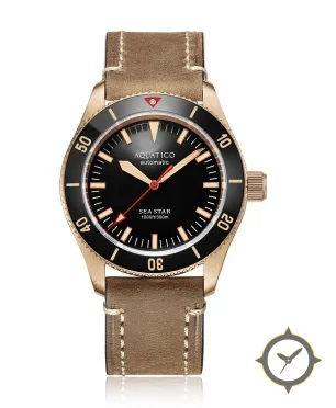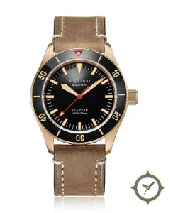 A Dive watch with a vintage-inspired 34.5mm case, crafted from bronze featuring a black dial with a unique sunburst finish.