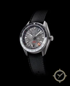 A GMT watch with a vintage-inspired 34.5mm case, crafted from stainless steel featuring a gray dial with a unique meteorite finish and a true GMT complication for tracking a second time zone.