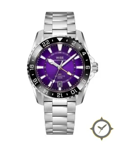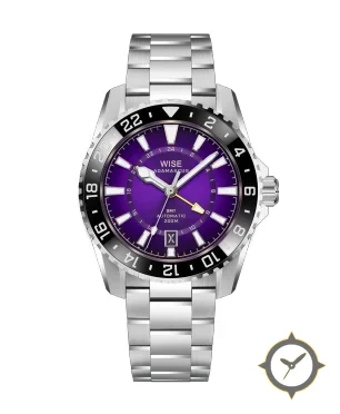 A GMT watch with a bold 42mm presence on the wrist, crafted from stainless steel featuring a purple dial with a unique sunburst finish and a true GMT complication for tracking a second time zone.