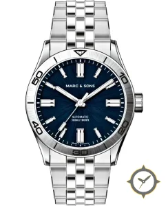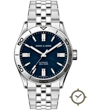 A Dive watch with a vintage-inspired 36.5mm case, crafted from stainless steel featuring a blue dial with a unique sunburst finish.