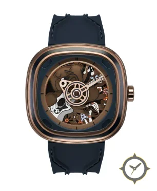 A Skeleton watch with a bold 43mm presence on the wrist, crafted from bronze featuring a brown dial with a unique open-worked / skeletonized with printed artistic motifs (flowers, musical notes) finish.