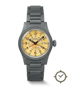 A GMT watch with a bold 45mm presence on the wrist, crafted from titanium featuring a gold dial with a unique subtle sunburst / textured grain finish and a true GMT complication for tracking a second time zone.