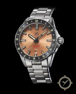 A Dive watch with a bold 44mm presence on the wrist, crafted from stainless steel featuring a brown dial with a unique radial brushed / textured copper finish finish.