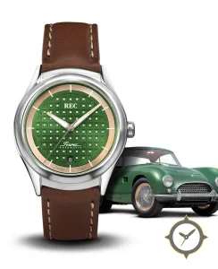 A Vintage watch with a versatile 38mm case, that suits most wrists, crafted from stainless steel featuring a green dial with a unique raised square waffle grid finish.