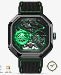 A Skeleton watch with a versatile 39mm case, that suits most wrists, crafted from stainless steel featuring a black dial with a unique open-worked, multi-layer skeleton with green accenting finish.