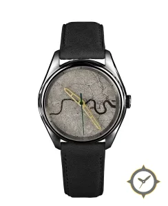 A Minimalist watch with a bold 46.5mm presence on the wrist, crafted from stainless steel featuring a gray dial with a unique engraved/map-like textured surface (city map) finish.