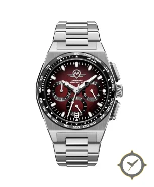 A Chronograph watch with a versatile 40mm case, that suits most wrists, crafted from stainless steel featuring a red dial with a unique sunburst finish.
