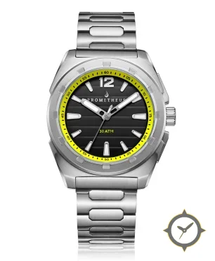 A Dive watch, crafted from stainless steel featuring a black dial with a unique horizontal ribbed finish.