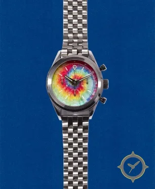 A Chronograph watch, crafted from stainless steel featuring a red dial with a unique rainbow tie-dye / gradient finish.