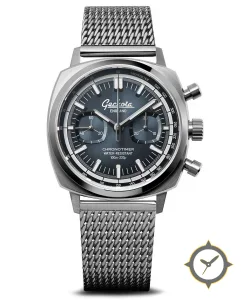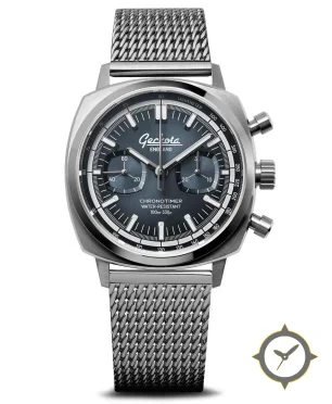 A Chronograph watch with a vintage-inspired 34mm case, crafted from stainless steel featuring a blue dial with a unique sunburst finish.