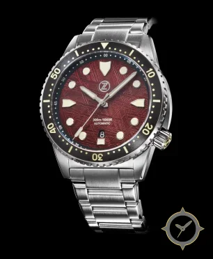 A Dive watch with a bold 49mm presence on the wrist, crafted from stainless steel featuring a red dial with a unique textured / meteorite-like pattern finish.