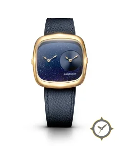 A Dress watch with a vintage-inspired 34.5mm case, crafted from gold featuring a blue dial with a unique aventurine (sparkling, star-field) finish.