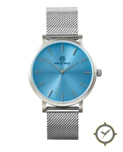 A Minimalist watch with a bold 43mm presence on the wrist, crafted from stainless steel featuring a blue dial with a unique sunburst finish.