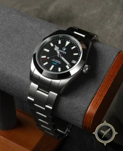A Sports watch with a vintage-inspired 37mm case, crafted from stainless steel featuring a black dial with a unique matte finish.