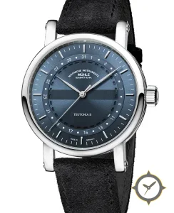 A Dress watch with a bold 47mm presence on the wrist, crafted from stainless steel featuring a blue dial with a unique sunburst with a horizontal band across center finish.