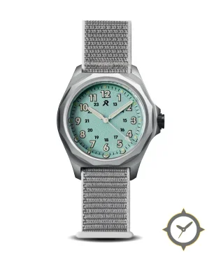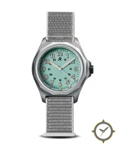 A Field watch with a bold 42mm presence on the wrist, crafted from titanium featuring a turquoise dial with a unique sandblasted finish.