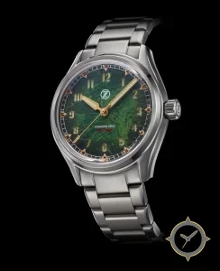 A Field watch with a vintage-inspired 33.5mm case, crafted from stainless steel featuring a green dial with a unique mottled/forest textured finish finish.