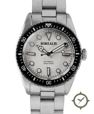 A Dive watch with a versatile 39mm case, that suits most wrists, crafted from stainless steel featuring a white dial with a unique mother-of-pearl finish.