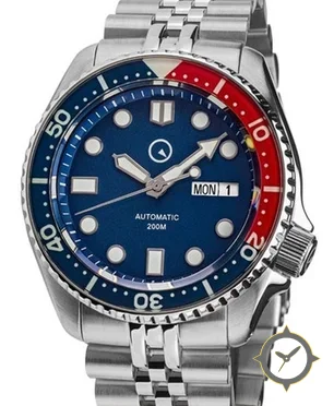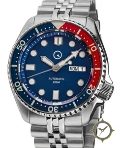 A Dive watch with a vintage-inspired 36mm case, crafted from stainless steel featuring a blue dial with a unique sunburst finish.