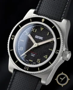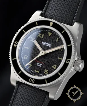 A Dive watch with a bold 43.5mm presence on the wrist, crafted from stainless steel featuring a black dial with a unique granular textured finish.