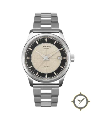 A Vintage watch with a bold 43.5mm presence on the wrist, crafted from stainless steel featuring a white dial with a unique grainy / sandblasted texture finish.