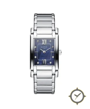 A Dress watch, crafted from stainless steel featuring a blue dial with a unique mother-of-pearl finish.