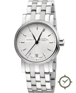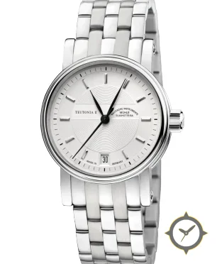 A Dress watch with a vintage-inspired 33mm case, crafted from stainless steel featuring a white dial with a unique concentric guilloche center with smooth outer chapter ring finish.