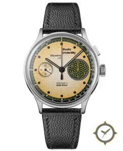 A Chronograph watch with a bold 43.5mm presence on the wrist, crafted from stainless steel featuring a gold dial with a unique granular / sandblasted texture finish.