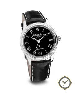 A Dress watch with a vintage-inspired 33mm case, crafted from stainless steel featuring a black dial with a unique glossy finish.