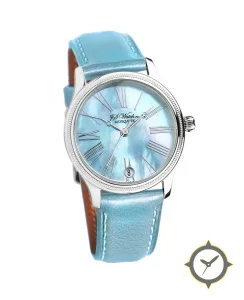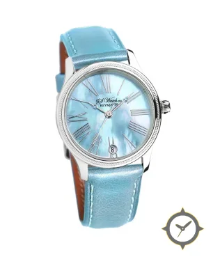 A Dress watch with a vintage-inspired 32mm case, crafted from stainless steel featuring a turquoise dial with a unique mother-of-pearl finish.