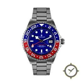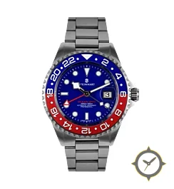 A GMT watch with a bold 43.5mm presence on the wrist, crafted from stainless steel featuring a blue dial with a unique sunburst finish and a true GMT complication for tracking a second time zone.