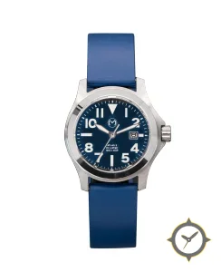 A Field watch with a vintage-inspired 33.5mm case, crafted from stainless steel featuring a blue dial with a unique matte finish.