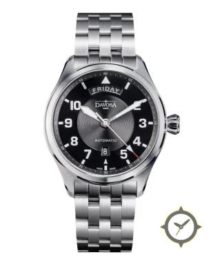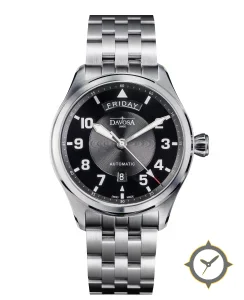 A Pilot watch with a bold 46.5mm presence on the wrist, crafted from stainless steel featuring a black dial with a unique concentric guilloche / slight sunburst finish.