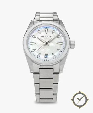 A Sports watch with a vintage-inspired 34.5mm case, crafted from stainless steel featuring a white dial with a unique mother-of-pearl (iridescent) finish.